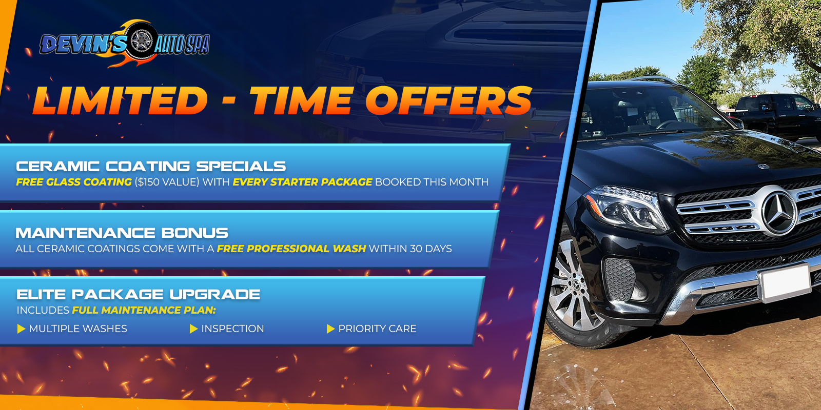 Get lasting protection, enhanced shine, and easier maintenance with our ceramic coating packages, now featuring BONUS GLASS COATING, PRO WASH, AND MAINTENANCE UPGRADES for a limited time.